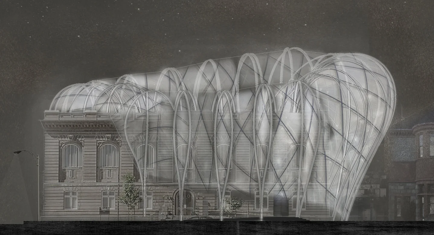 My museum addition introduces a new face to the current AAMLO providing a sculpture garden, a daylight gallery, cafe, and a reading area that wraps the current building facade. A lightweight structure made out of wood and ETFE wraps the existing exterior structure and burrows into the core of the building; embellish the old and the new with daylight. The new spaces introduce contemporary program to continue a new legacy of art and literature of the space.